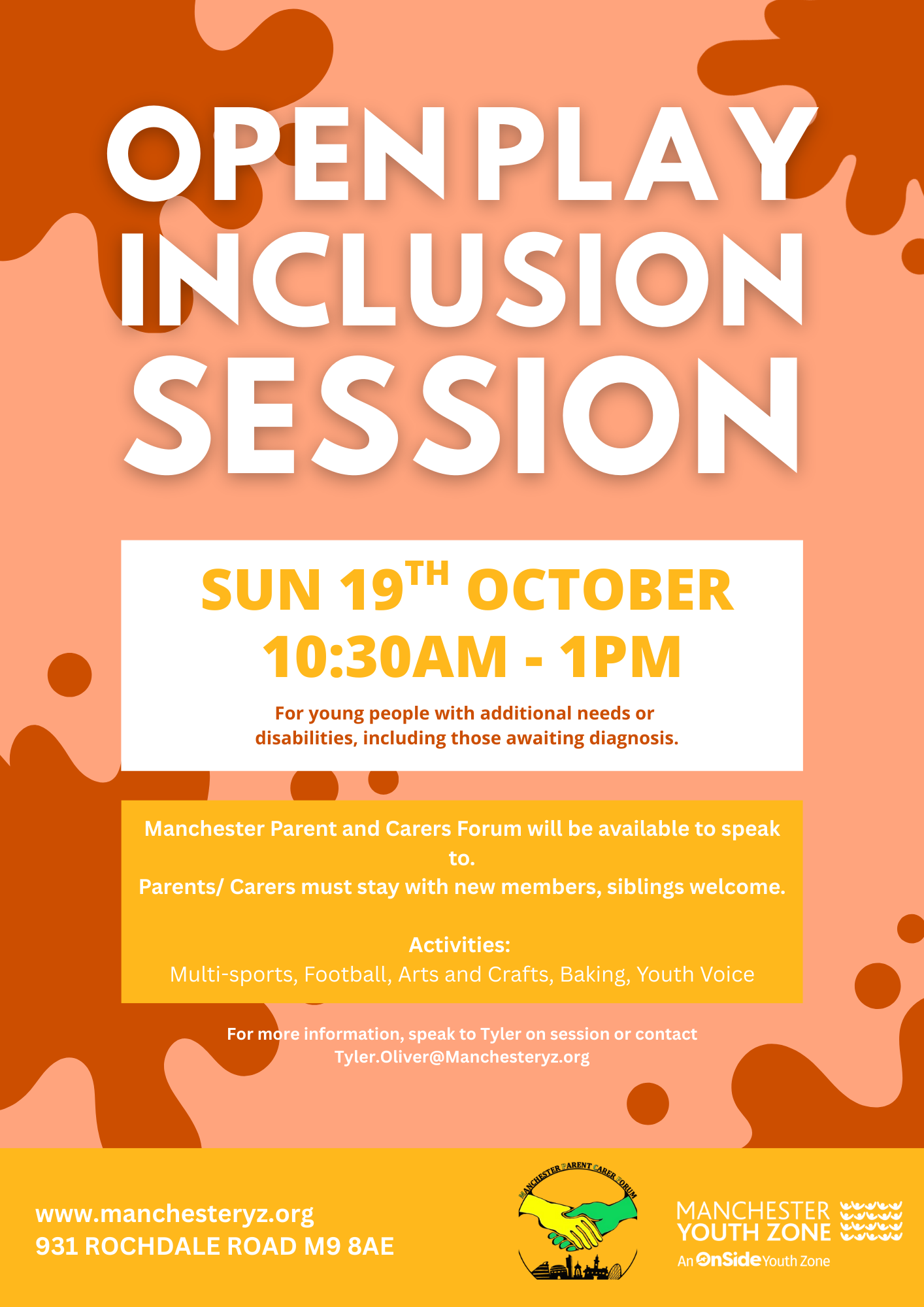 Join us and our friends from Manchester Youth Zone, as they host an inclusive Open Play taster session of their Inclusion Days, where deaf, disabled and neurodivergent children and young people can enjoy arts and crafts, baking, and various sports activities! Siblings are also
