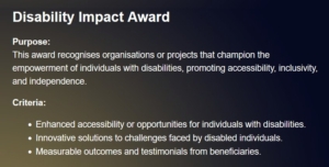 The Disability Impact Award recognises organisations or projects that champion the empowerment of individuals with disabilities, promoting accessibility, inclusivity, and independence.