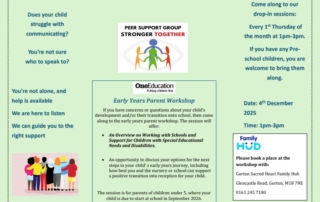 Sacred Heart Family Hub invites parents and carers to their new SEND Peer Support sessions! In this session, educational psychologists from One Education will be delivering an Early Years workshop for parents/carers of children under 5, particularly if your child is due to start at