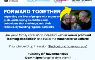 The Forward Together project would like to invite parents and carers of individuals with severe or profound learning disabilities* living in Manchester or Salford to a "Community of Practice" (CoP) event where you can have a chance to: Meet other families in the same